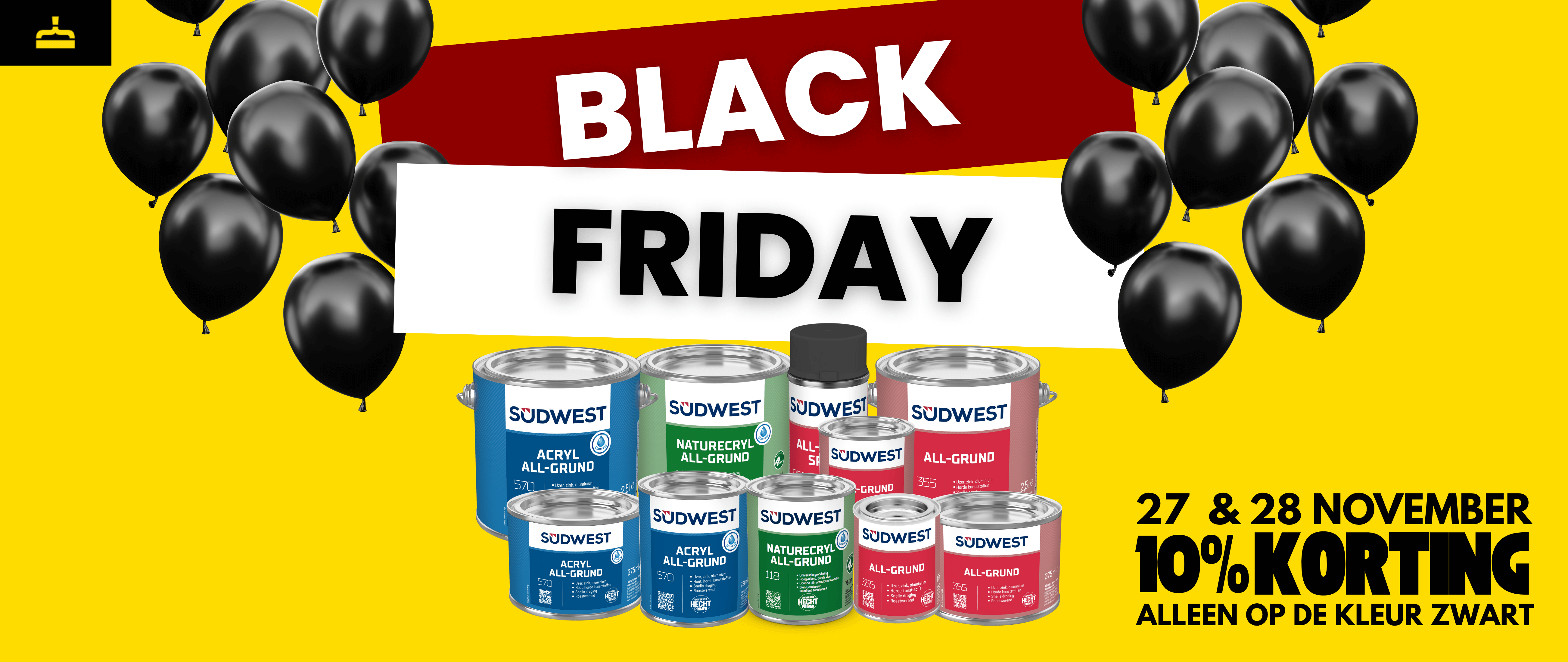 Speciaal voor jouw als groothandel hebben we een BLACK FRIDAY DEAL, die je niet mag missen! Alleen van 24 t/m 28 november krijg jij als groothandel 10% korting per colli op ALLE ZWARTE KLEUREN VAN DÉ NR. 1 hechtprimers van het Südwest All-GRUND-concept. Pak vandaag nog je kans en bestel deze Black Friday-actie via het bestelformulier hier rechts. En jouw klanten? Die ontvangen op 27 & 28 november 10% BLACK FRIDAY KORTING per verpakking.