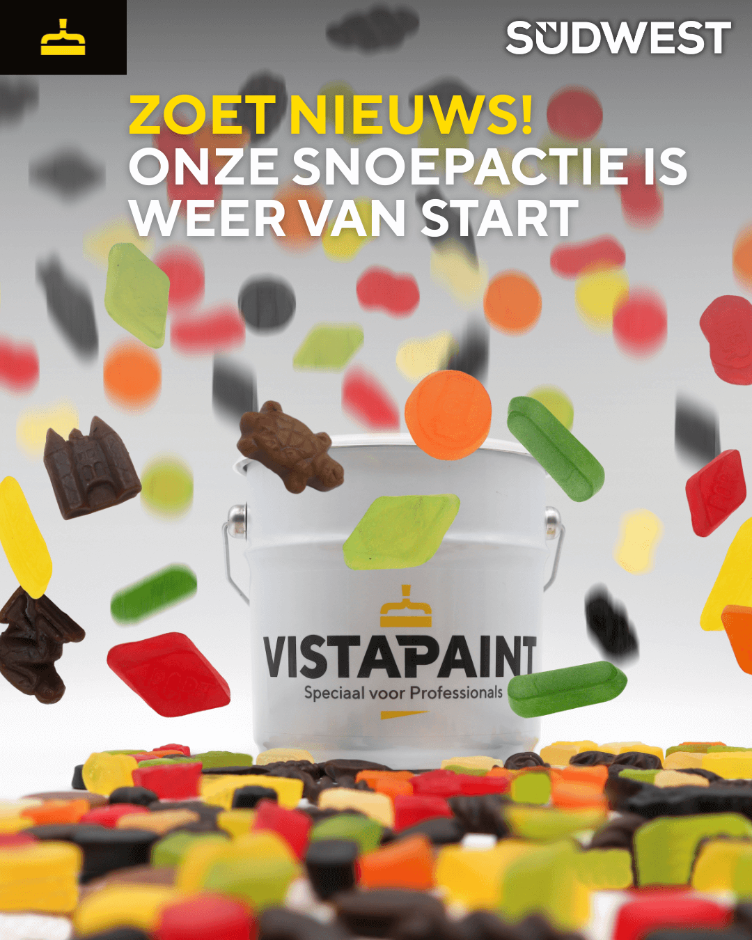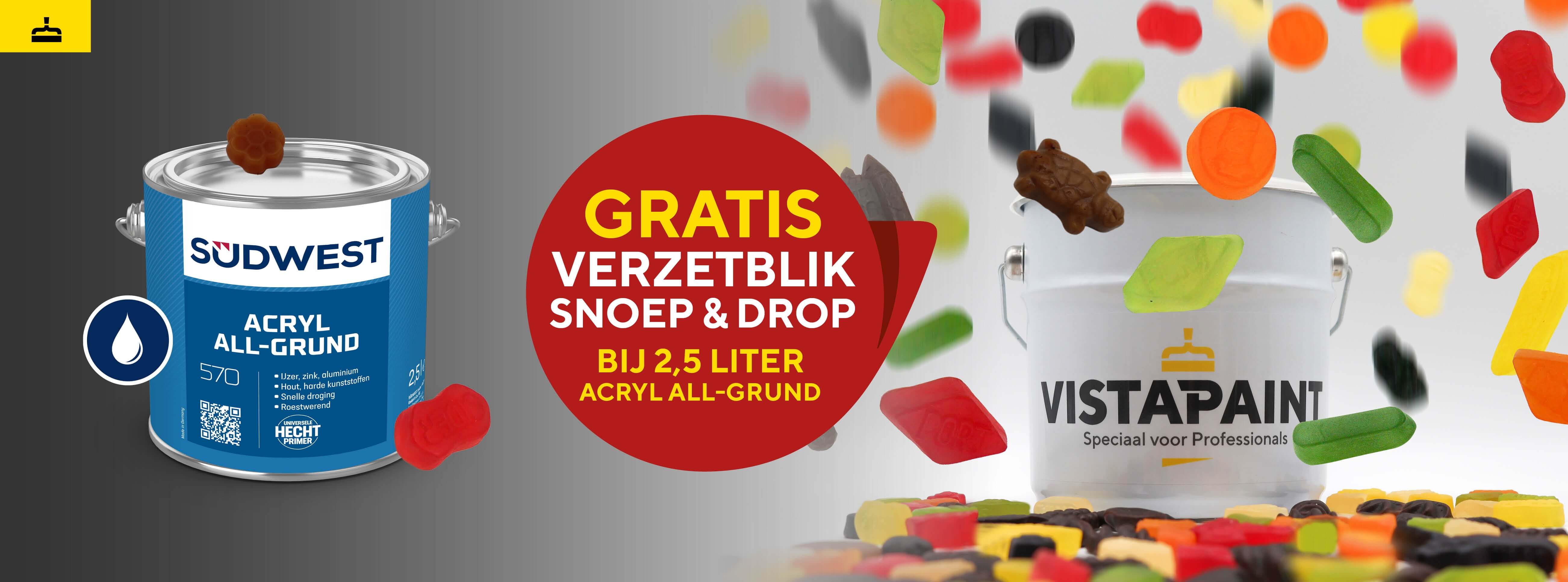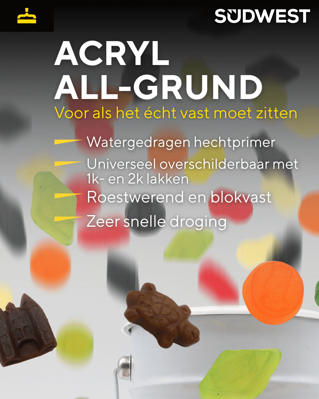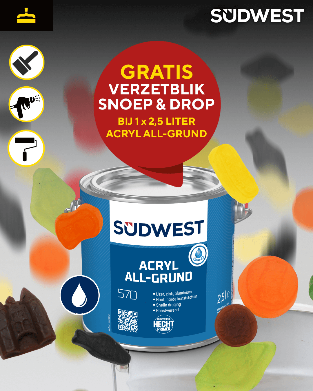 Als het écht vast moet zitten, begin je met Südwest Acryl All-Grund. De nummer 1 hechtprimer en de ideale basis voor een strak eindresultaat. Als extraatje bij deze sterke primer is onze bekende snoepactie vanaf NU weer terug. Bij afname van 4 x 2,5 liter Südwest Acryl All-Grund in de kleuren zwart, wit en grijs ontvang je gratis 4 verzetblikken met snoep-dropmix.