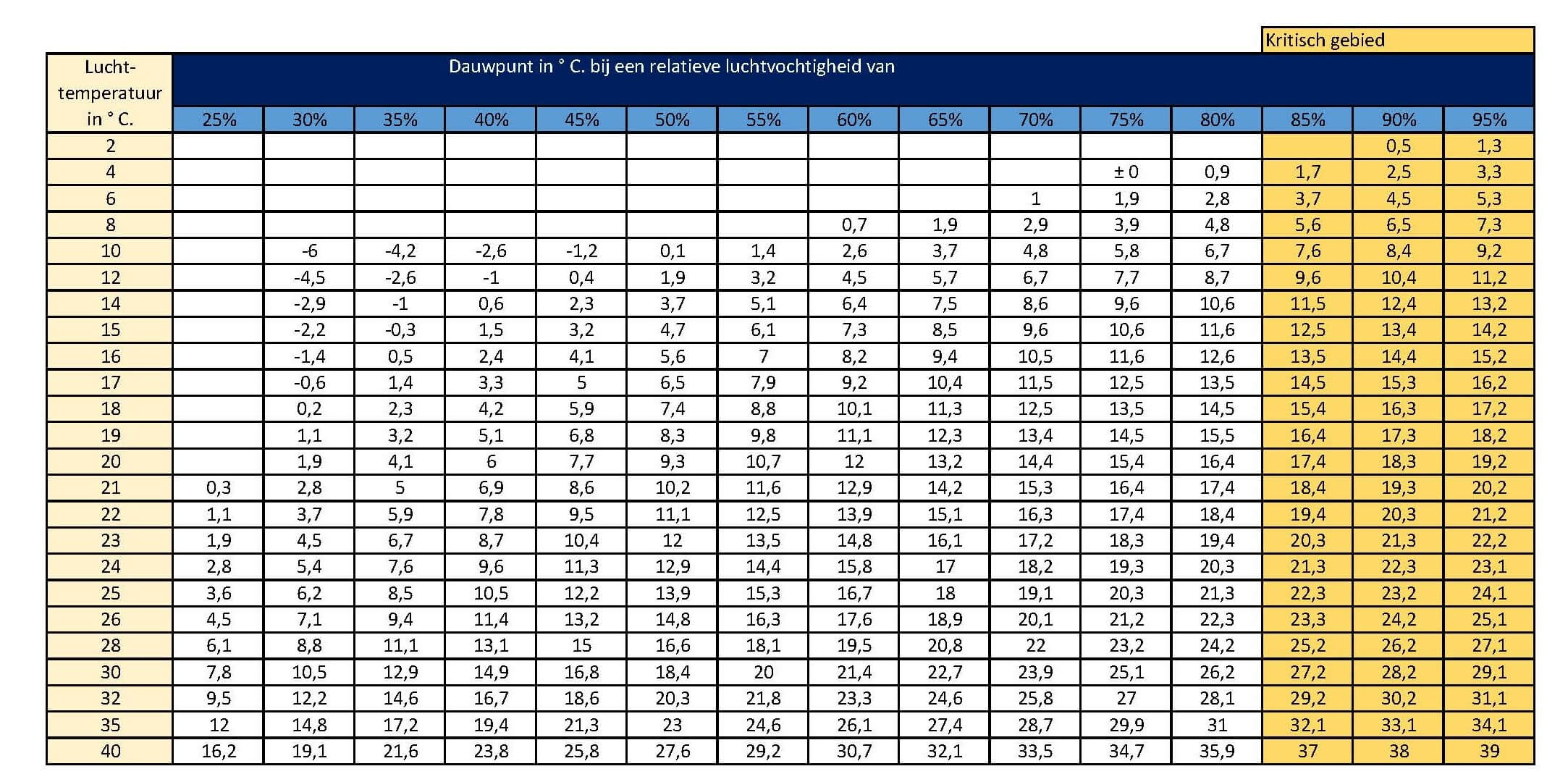 Ligt de oppervlaktetemperatuur te dicht bij het dauwpunt, dan is de kans op problemen groot, ook als de luchttemperatuur nog acceptabel lijkt.