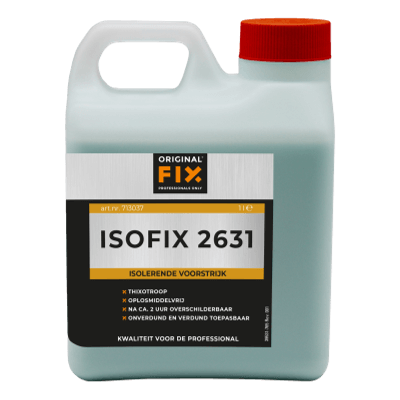 Voor dit doel adviseren wij de OriginalFIx Isofix 2631. Dit is een isolerende voorstrijk voor diepte- en oppervlakteversterking en speciaal ontwikkeld voor sterk zuigende ondergronden zoals spachtelputz. Breng je IsoFix 2631 verdund aan in een verhouding van 1 op 3 met water, dan werkt het product niet alleen zuigregulerend, maar fixeert het ook de ondergrond. Zo worden losse of poederende delen vastgezet en ontstaat een stabiele basis voor verdere afwerking. Breng je de voorstrijk onverdund aan, dan kan deze bovendien lichte vlekken en verkleuringen isoleren.